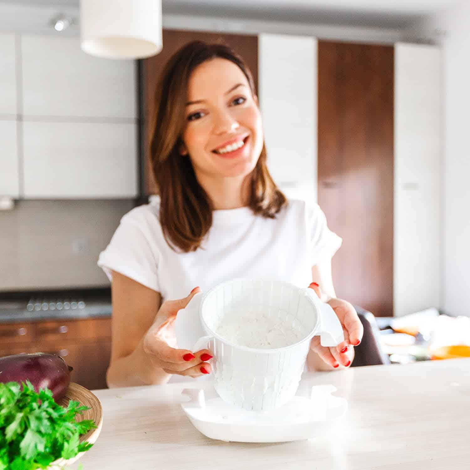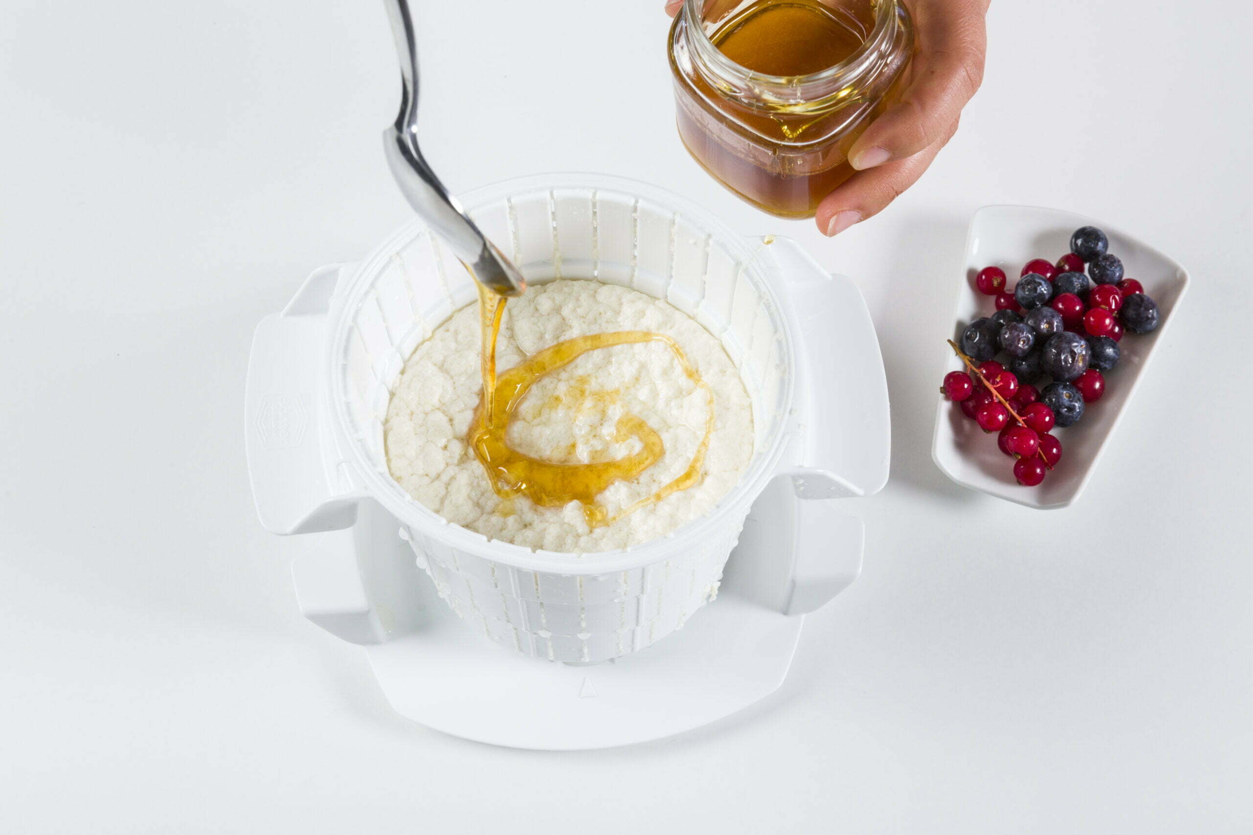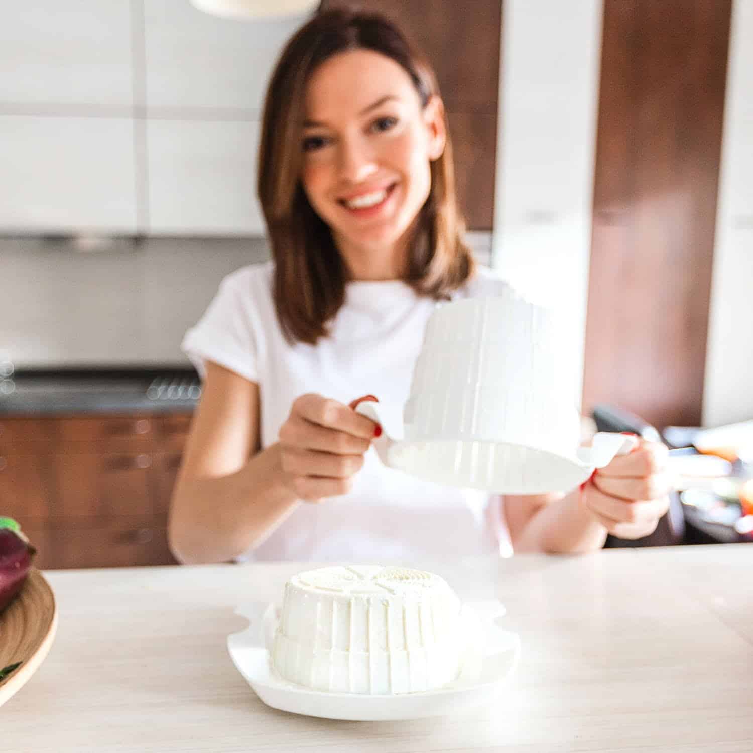 But how is cheese made? It really is child’s play. With Borner’s original recipe, you need milk (cow’s or soy milk), a microwave or a standard pot and a coagulant such as lemon juice or vinegar. The milk is first heated, then coagulated with the coagulant and finally poured into the Borner Cheesemaker. The Borner Multimaker is ideal for this! Here you will find a set of Multimaker and Cheesemaker.