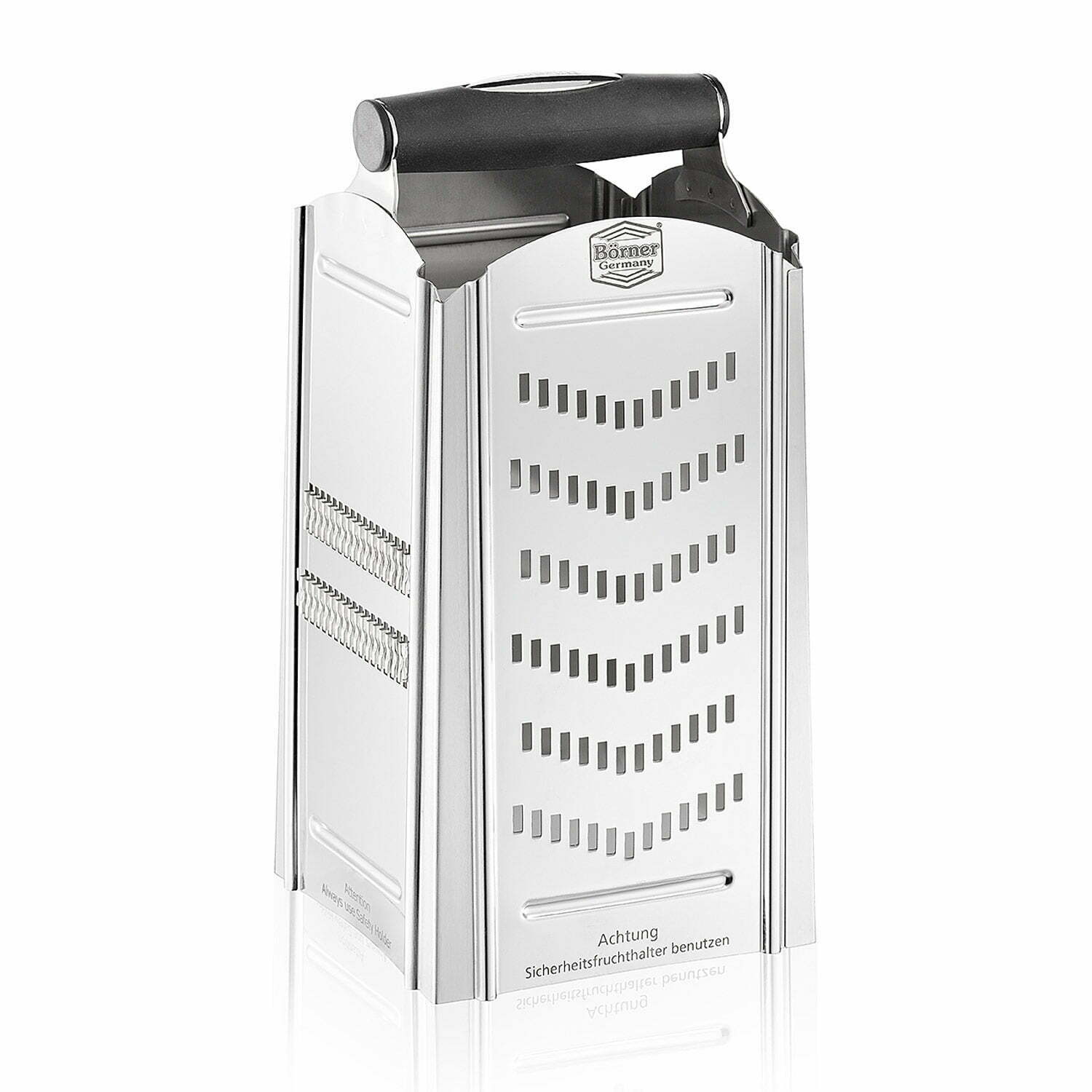 Combine four functions in one device! The Borner Combi Chef square grater made of stainless steel is ideal for your kitchen if you want to cut slices, raw vegetable julienne strips or also grate hard cheese as well as wider vegetable strips. This makes it a practical and reliable kitchen helper that leaves nothing to be desired.