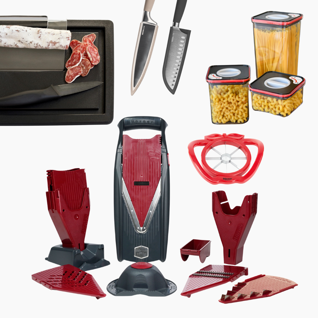Börner vous propose un set exceptionnel, unique et en édition limitée pour le Black Friday : un ensemble complet regroupant la mandoline Vital, ses accessoires premium, des ustensiles de découpe professionnels et un set de conservation hermétique.